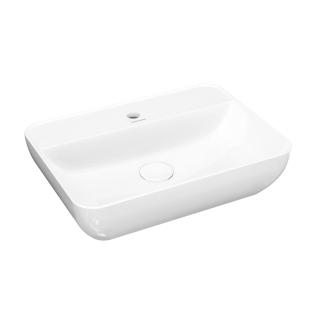 Белая глянцевая накладная раковина с отверстием под смеситель, ширина 55 см. Донный клапан в комплект не входит, рекомендованный донный клапан DRR.1/WHT. Донный клапан конструктивно не закрывается полностью, так как у раковины отсутствует отверстие слив-перелив. Подходит для установки на столешницы PL1. Сочетается с тумбами PLAZA Classic, PLAZA Modern и металлическими конструкциями PLAZA Next.
