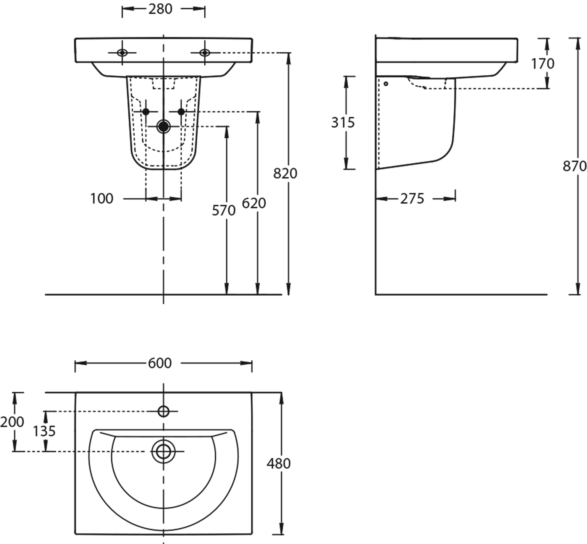Подвесной полупьедестал PRO позволяет скрыть сифон и технические отверстия при установке раковины BUONGIORNO шириной 55 до 60 см без мебели и раковины PRO шириной 50 см. Такое решение подойдёт для гостевых санузлов, а также для проектного использования.